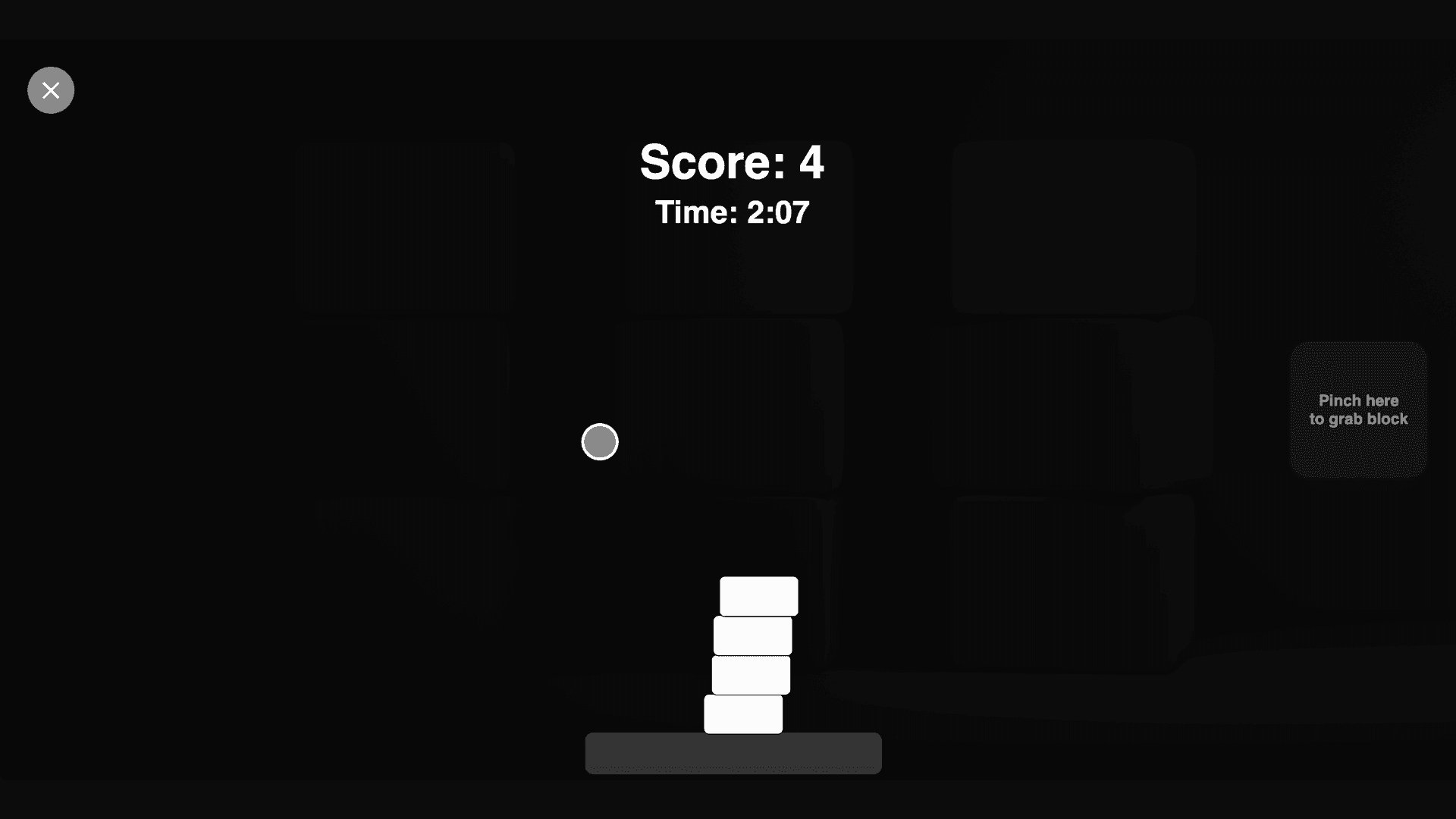 Pinch to pick up a block from the right and drag it to the platform in the middle to stack as many blocks as you can within the 2 and a half minute time limit.